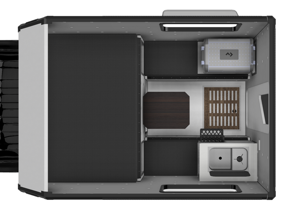 A roomy, ultralight truck camper featuring our modular layout system that comfortably accommodates 2 adults.